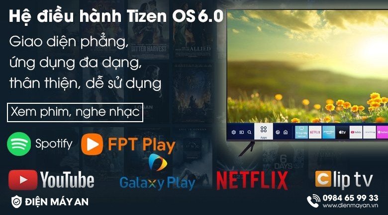 - Tivi Samsung 4K sử dụng hệ điều hành Tizen OS 6.0 với giao diện phẳng thân thiện và tiện lợi. Nó cung cấp một loạt các ứng dụng có sẵn và có thể tải thêm như Galaxy Play (Fim+), Clip TV, FPT Play, MyTV, Netflix, YouTube,... để đáp ứng nhu cầu giải trí của tất cả các thành viên trong gia đình bạn.