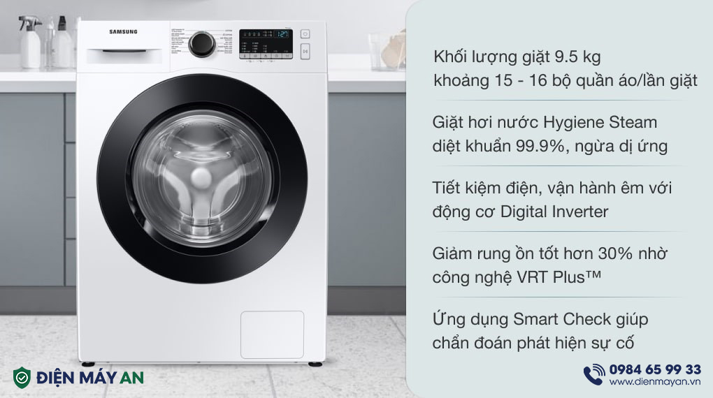 Thêm các ưu điểm nổi bật như, công nghệ tiết kiệm điện hiệu quả Digital Inverter giúp máy hoạt động êm ái, cùng với việc trang bị công nghệ QuickDriver giặt xả nhanh chóng, tiết kiệm thời gian, kết hợp công nghệ giặt khô AirWash khử mùi, diệt khuẩn lên đến 99% mang lại sự thoải mái và an toàn cho quần áo nhà bạn.