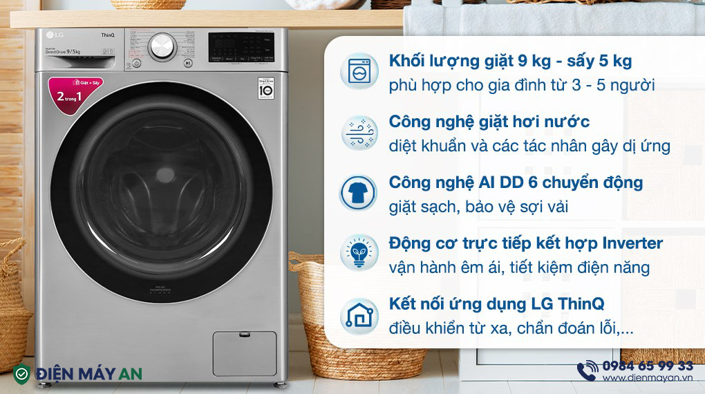 Với thiết kế công nghệ giặt hơi nước Steam diệt vi khuẩn, loại bỏ các tác nhân gây dị ứng, giảm nhăn quần áo. Máy giặt sấy tích hợp công nghệ giặt 6 chuyển động DD cùng với động cơ truyền động trực tiếp AI, bảo vệ từng sợi vải.