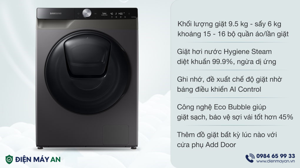 Máy giặt sấy Samsung Addwash Inverter WD95T754DBX/SV được thiết kế thời thượng, sang trọng, thẩm mỹ cao. Với khối lượng giặt 9.5kg, sấy 6kg và 24 chương trình giặt đa dạng, rất phù hợp cho gia đình từ 5 -7 thành viên sử dụng.