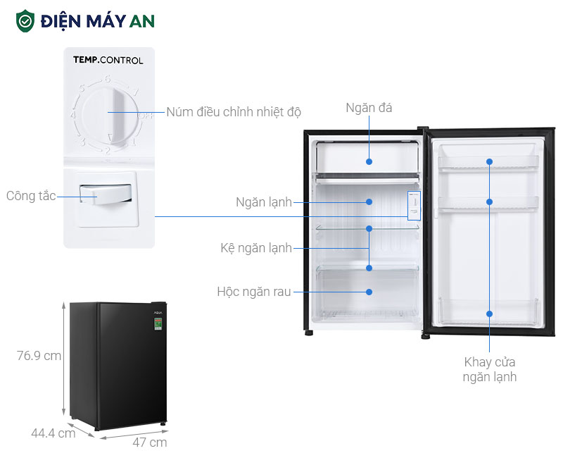 - Tủ lạnh được tích hợp núm vặn điều chỉnh nhiệt độ, cho phép người dùng dễ dàng thiết lập mức lạnh phù hợp với từng loại thực phẩm lưu trữ.