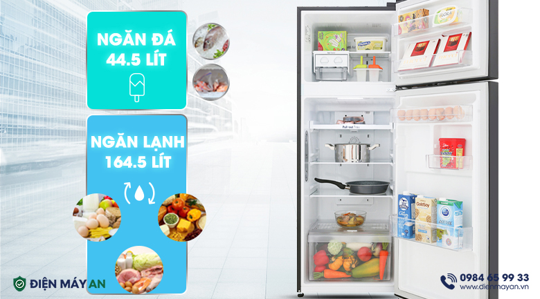 Chiếc tủ lạnh LG này có dung tích lên đến 209 lít, đáp ứng nhu cầu bảo quản thực phẩm cho gia đình có từ 2 - 3 người.
