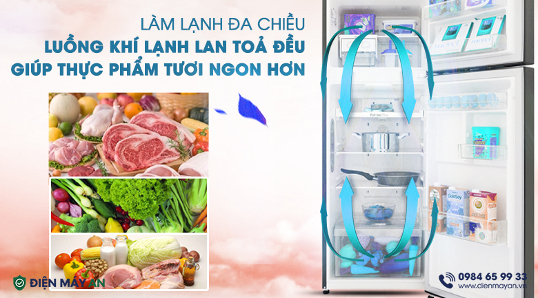 Tủ lạnh GN-M208BL với hế thống làm lạnh đa chiều, thổi các luồng khí lạnh bên trong tủ luân chuyển đến từng vị trí ngóc ngách, đảm bảo độ lạnh luôn duy trì ổn định, đồng đều cho từng thực phẩm, giúp thực phẩm được làm lạnh nhanh chóng và đều hơn, giữ được sự tươi ngon lâu dài.