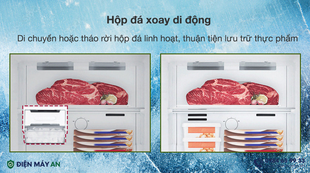 - Hộp đá di chuyển dễ dàng, bao gồm khay làm đá dạng xoay, hộc chứa đá viên phía dưới.