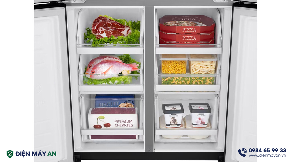 - Ngăn đá của tủ lạnh GR-D22MBI được chia làm 2 bên, nên việc sắp xếp thực phẩm sống được tách riêng ở một bên ngăn.