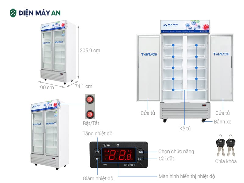 Tủ mát Hòa Phát 723 lít HSR D6723 là lựa chọn lý tưởng cho các nhà hàng, quán cà phê, cửa hàng thực phẩm cần thiết bị bảo quản dung tích lớn, làm lạnh nhanh và tiết kiệm điện. Với công nghệ Nofrost chống đóng tuyết, kính Low-E chống đọng sương và thiết kế chắc chắn, hiện đại, sản phẩm không chỉ mang lại hiệu quả bảo quản tối ưu mà còn giúp không gian kinh doanh thêm chuyên nghiệp và gọn gàng. Hãy liên hệ tại fanpage Điện máy Quang Hưng hoặc gọi điện thoại theo số Hotline 𝟎𝟗𝟗 𝟑𝟑𝟗 𝟓𝟔𝟔𝟖 để được tư vấn chi tiết và “ring” ngay chiếc tủ mát hiện đại, bền bỉ cho gia đình bạn ngay hôm nay.